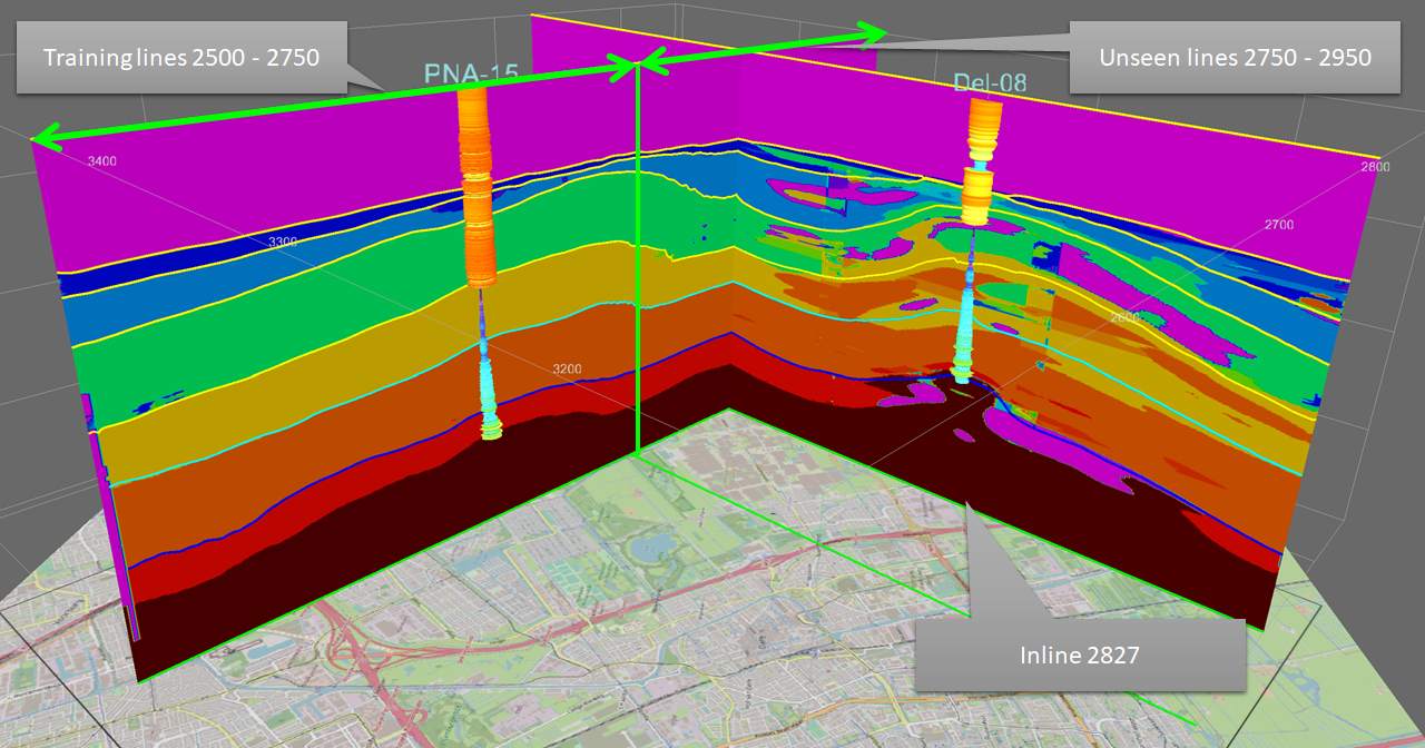 Synthetic data over the city of Delft. The synthetic data set was created in OpendTect from a set of interpreted 3D horizons and 2 wells with Acoustic Impedance logs. The logs were interpolated in the Volume Builder. The synthetic seismic volume, interval labels volume (mask) and Two-Way-Time volume were created in the attribute engine. Seismic inline through DEL-08 shows synthetic seismic co-rendered with target labels. Seismic crossline through PNA-15 shows synthetic seismic co-rendered with Two-way time.