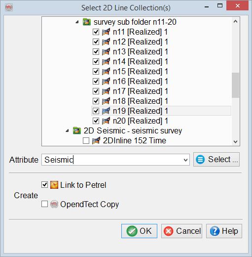 Select 2D Line Collection(s) window allows to select 2D seismic data from Petrel* project, provide a dataset name in the Attribute field and create either Link to Petrel* or OpendTect Copy.