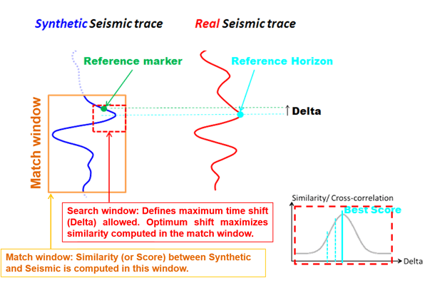 - The actual seismic traces in the volume are correlated with synthetic seismic from modeled wells.