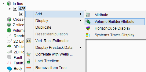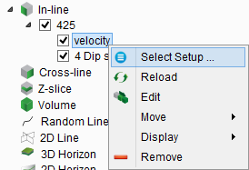 Pressing "Add velocity display" in the right-click menu of a slice (inline, crossline, time-slice) adds a special layer. Its right-click menu does not allow the selection of stored volumes or attributes, but the selection of a stored volume processing (gridding) flow.