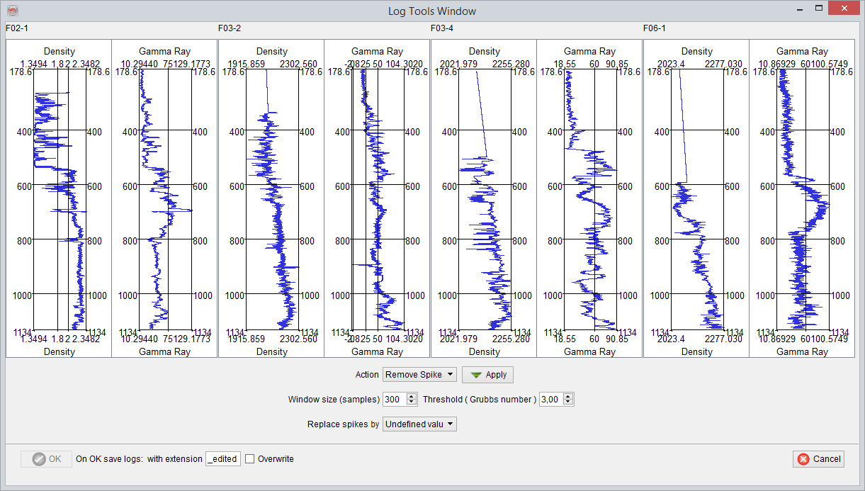 Remove spikes: De-spiking of the logs can be done by specifying a window size (samples) and the Threshold for the Grubbs algorithm. Further, the removed spike values can be replaced by 'Undefined values', 'Interpolated values' or can be manually specified.