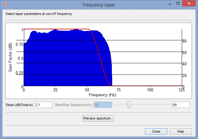 Once the Frequency Taper is displayed (red line in a pop-up window), a spectrum on any inline/crossline can be viewed by pressing the Preview Spectrum button. It will prompt to select an inline/crossline ("Select line from Data"). In that dialog select either inline or crossline radio button and press Next. Sub select the part of inline/crossline and proceed. A blue coloured amplitude spectrum will be displayed (as shown below). Now adjust the parameters (Slope or Start/Stop Frequency) and finalize the frequency taper settings.