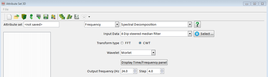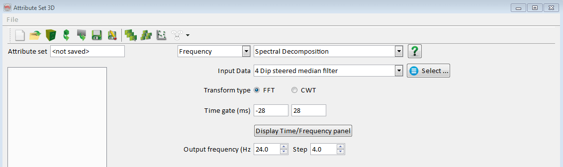 The output frequency is best determined using the time-frequency spectrum panel. This panel displays the spectral decomposition output for all frequencies between 0 and the Nyquist frequency of the data, computed with a step of 1Hz. One must first select a position for this single trace analysis: