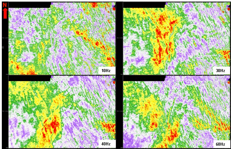 Spectral Decomposition (CWT) applied to a horizon. Notice that each index frequency is describing the specific parts of channels (NNE-SSW oriented). Also thinner and thicker parts of horizon along channels are highlighed clearly.