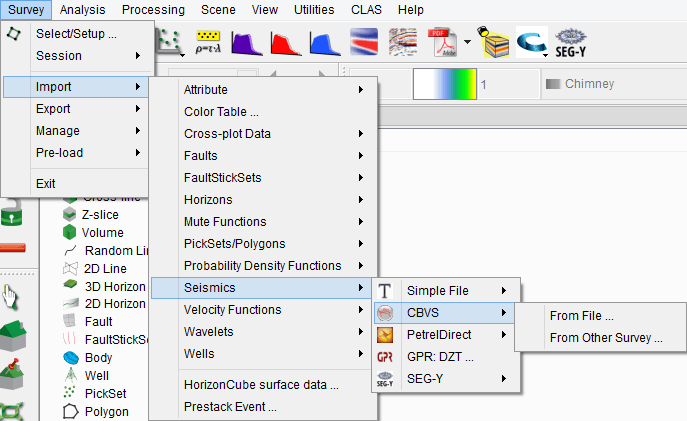 Seismic in CBVS format can be import either directly from cbvs file or from other survey(s) as shown below