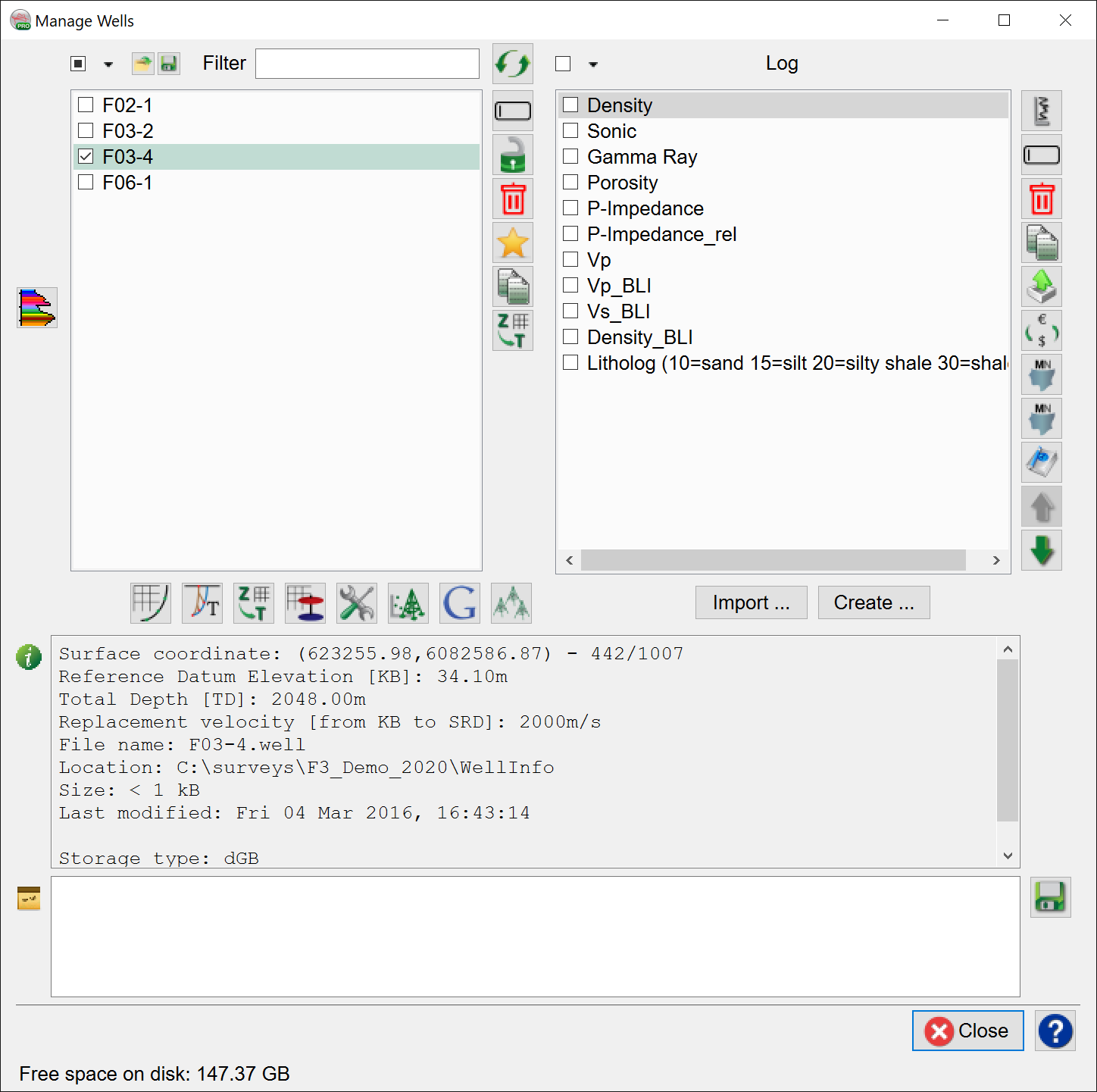 Logs can be imported from Ascii files, click on Import..., or created using mathematical expressions from the well management window, click on Create....
