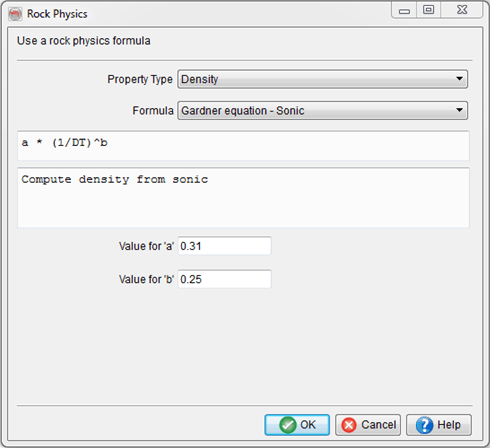 The type of output log quantity is chosen from Property Type list (e.g. Density, Velocity and Pressure). Afterwards, a specific formula out of a number of possible alternatives can be chosen to compute the required log quantity. The choice of equation depends on several factors such as the type of available log quantity and the region (e.g. a rock physics equations might work well in Gulf of Mexico but not in North Sea). After this selection has been made, the formula will be displayed along-with a short description below it.