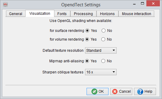 Using this option, one may set both the default resolution and default colortable for horizons. This is an especially helpful option for orientation in the early stages of a project when many horizons are loaded.